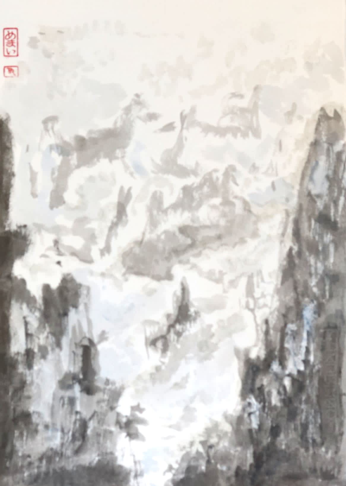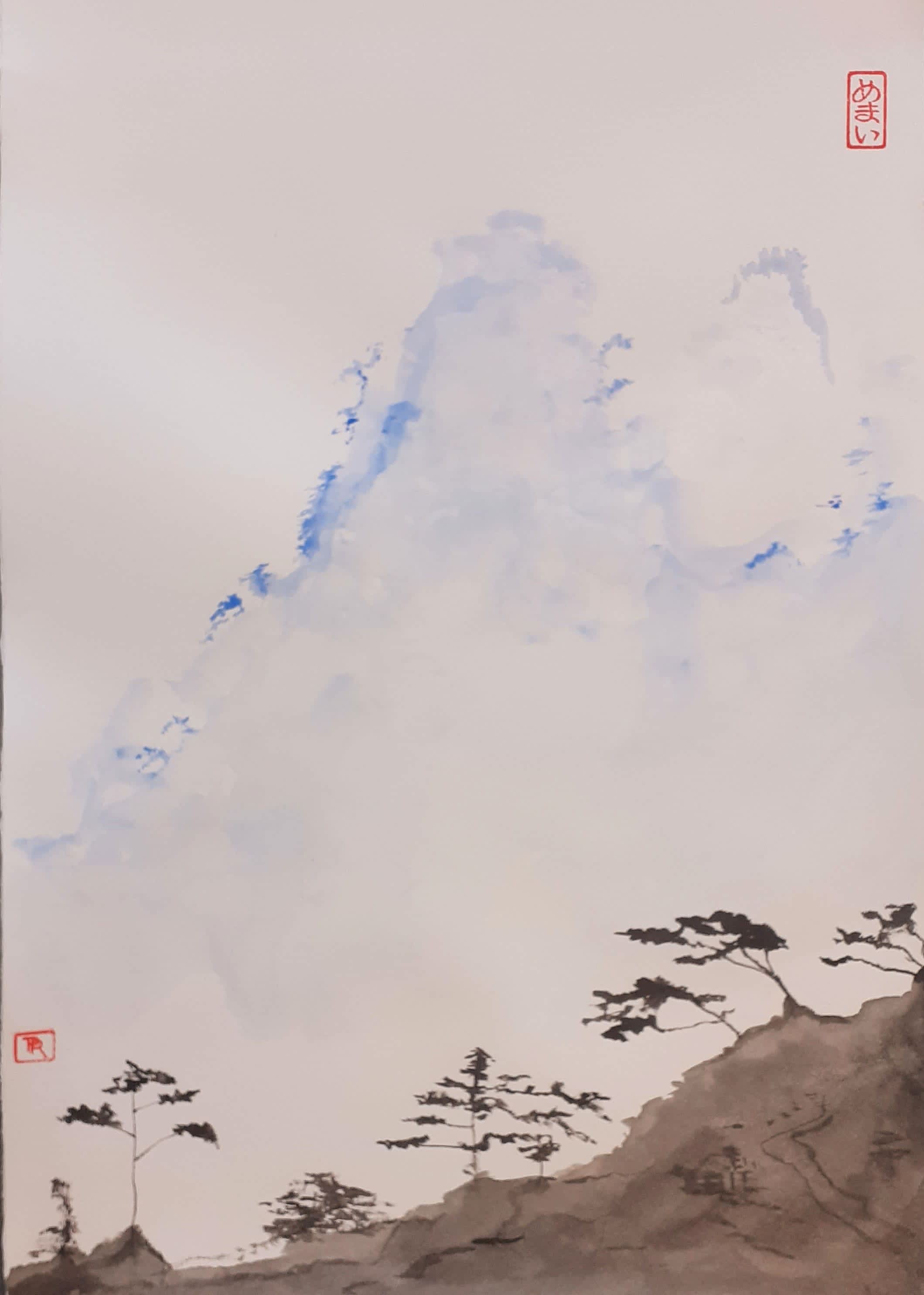 Après des années de travaux avec les techniques classiques, huile, pastel, mine de plomb, acrylique, plume, je m'oriente vers une approche de l'art japonais. Travaux exigeants sur papier washi ! J'utilise des batônnets d'encre que je délaye dans un peu d'eau sur des pierres de laves. Temps de préparation comme un recueillement face aux travaux à exécuter avec toujours de la joie et la surprise. Surprise car il faut jouer avec les matières qui me à d'autres réalités. Je signe avec un KANKO fabriqué au Japon. Mais j'ai toujours toujours le même plaisir à présenter et à partager au public ainsi qu'à me nourrir de ses remarques.