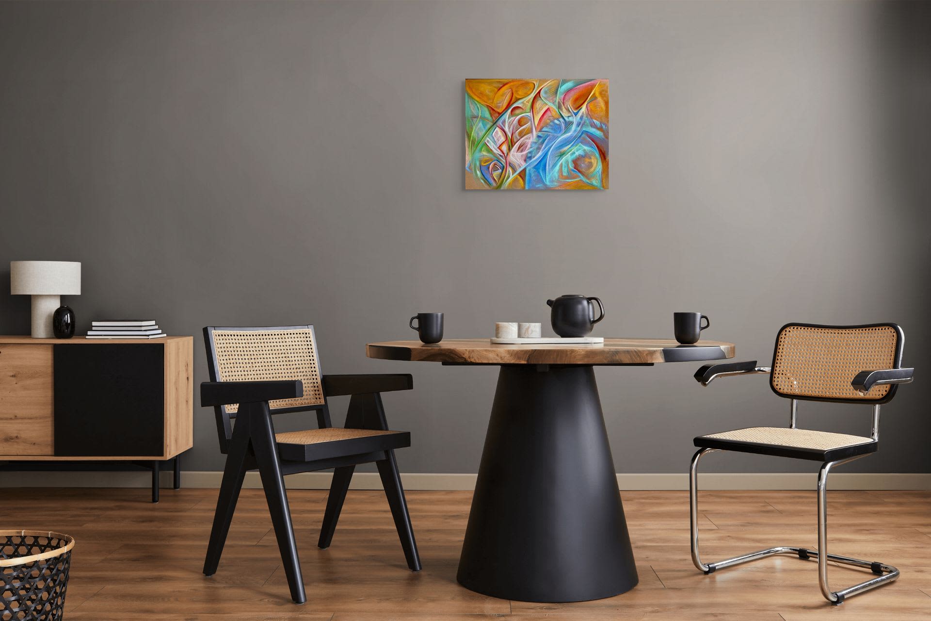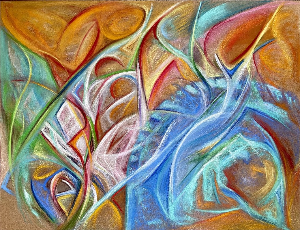 Pastel sur papier Dans cette « Parenthèse merveilleuse », Kristina Viera Wolf nous livre une partition d’abstraction lyrique d'une grande vitalité. Le pastel, travaillé avec une dextérité qui laisse deviner le geste de l’artiste, s’affranchit de la forme pour ne garder que la vibration. L’œuvre repose sur une chorégraphie de lignes sinueuses et organiques qui s'entrelacent dans un élan ascensionnel. Le jeu chromatique est saisissant : les ocres profonds et les orangés solaires se confrontent à des bleus électriques et des verts tendres, créant une tension lumineuse parfaitement équilibrée. La texture poudrée propre au pastel apporte une douceur vaporeuse à cette composition par ailleurs très dynamique. Plus qu’un simple paysage abstrait, ce tableau est une suspension temporelle, une respiration visuelle où la lumière semble sourdre du grain même du papier. Kristina Viera Wolf réussit ici le pari de rendre palpable l'invisible, transformant le support en un espace de liberté pure.